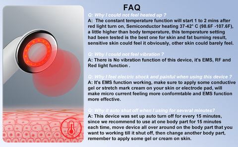 Використовуйте 30 Гц EMS, 1 МГц РЧ і 630 (±10) нм червоне світло для видалення твердого жиру в різних частинах тіла. Відчувається стукіт і тепло в частині дії.